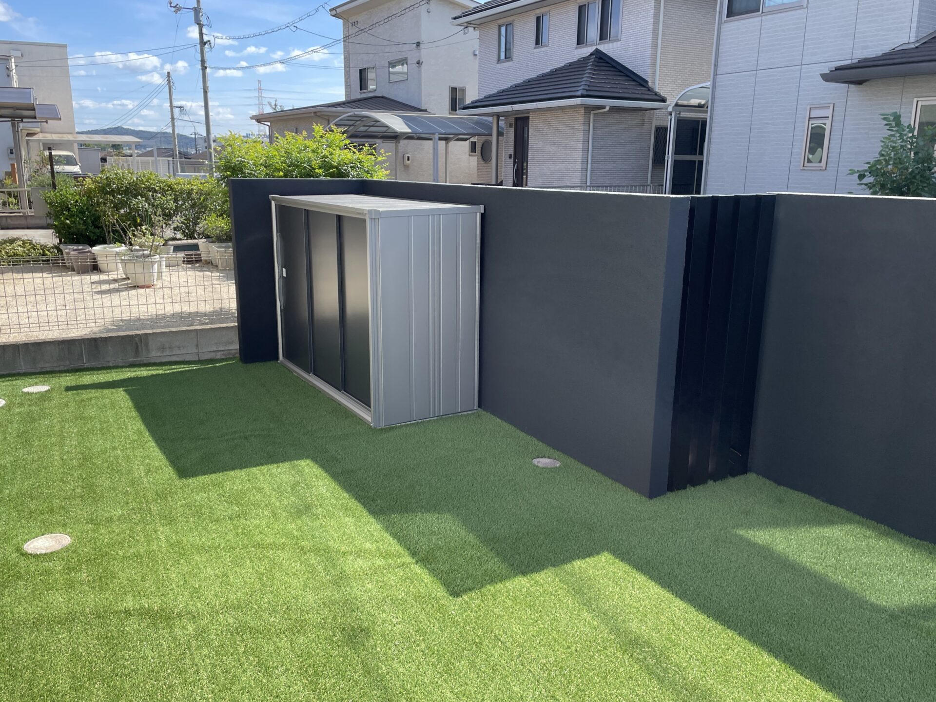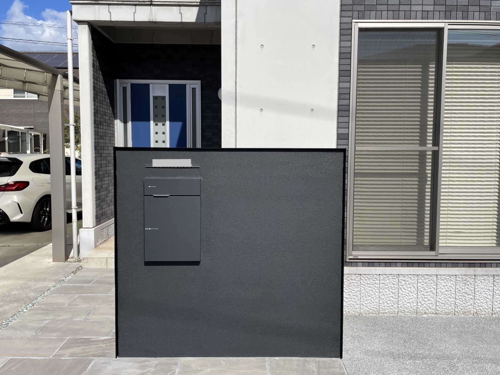 古くなった門柱を撤去し、新たに塗り壁門柱を設置しました。ポスト一体型の宅配ボックスは小スペースで便利です。