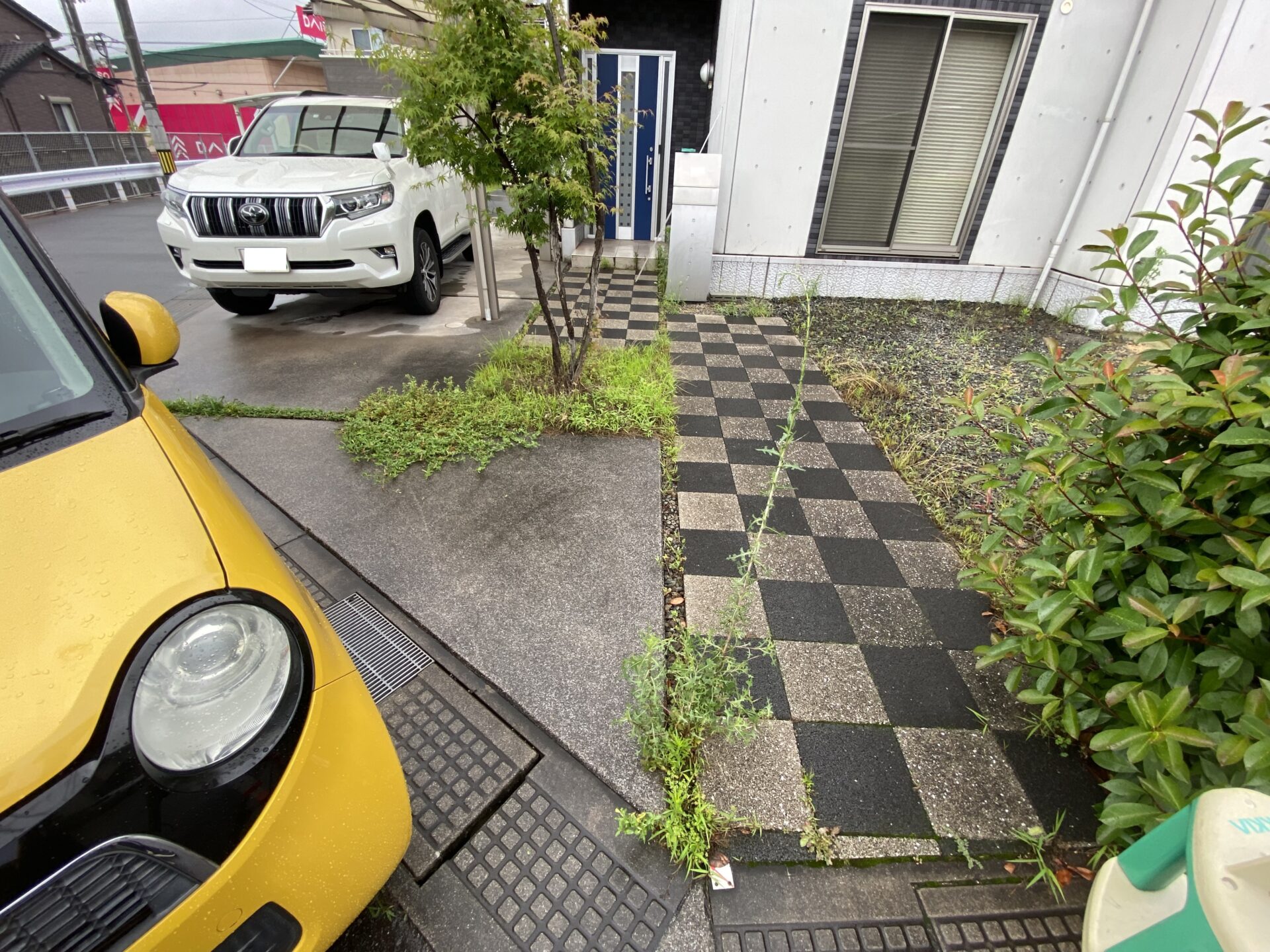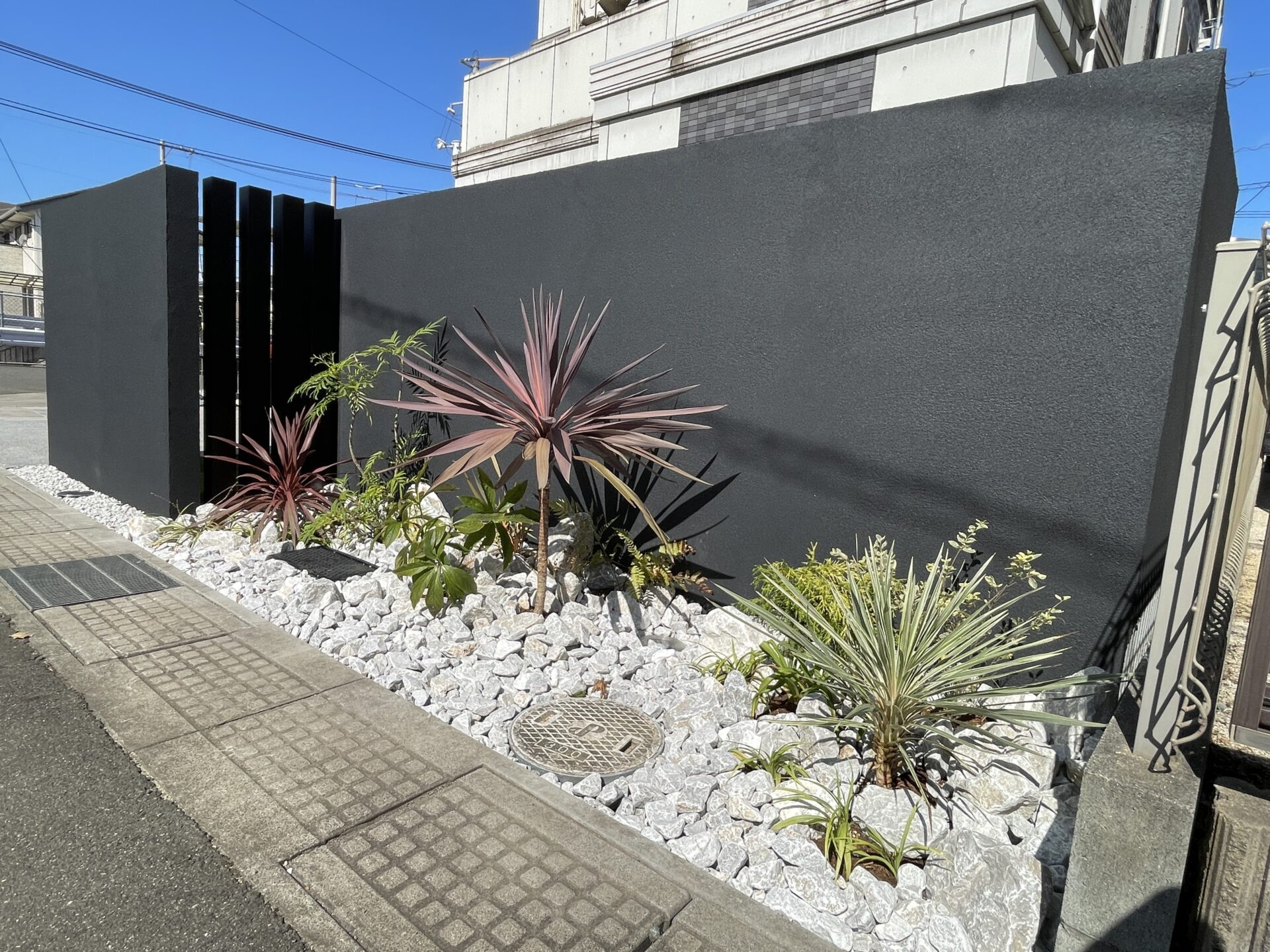 道路面の黒い塗り壁の前に白の景石と植栽をして色彩豊かなスペースができました。